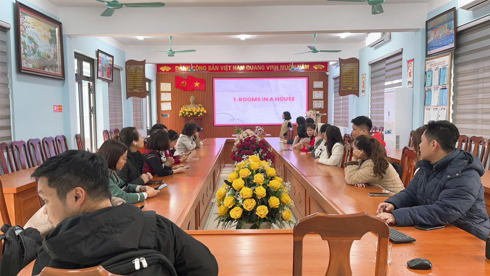 Các buổi học được tổ chức vào cuối tiết 4 mỗi sáng thứ 2 và thứ 3 hàng tuần, bảo đảm phù hợp với thời khóa biểu giảng dạy, không gây áp lực mà vẫn duy trì được tính đều đặn, hiệu quả. Trong các buổi sinh hoạt, giáo viên có năng lực ngoại ngữ tốt sẽ trực tiếp hướng dẫn, chia sẻ kiến thức và phương pháp học tập cho đồng nghiệp, tạo môi trường học tập thân thiện, cởi mở và tích cực. Mở đầu chuỗi hoạt động tháng 1, buổi học ngày thứ 2 (12/1) đã diễn ra sôi nổi với chủ đề “Room in a house”. Nội dung buổi học tập trung vào việc mở rộng vốn từ vựng, luyện phát âm và thực hành giao tiếp xoay quanh các phòng trong ngôi nhà. Giáo viên tham gia không chỉ được ôn luyện kiến thức cơ bản mà còn được thực hành thông qua các hoạt động hỏi – đáp, mô tả tình huống, giúp tăng khả năng ghi nhớ và vận dụng vào thực tế.