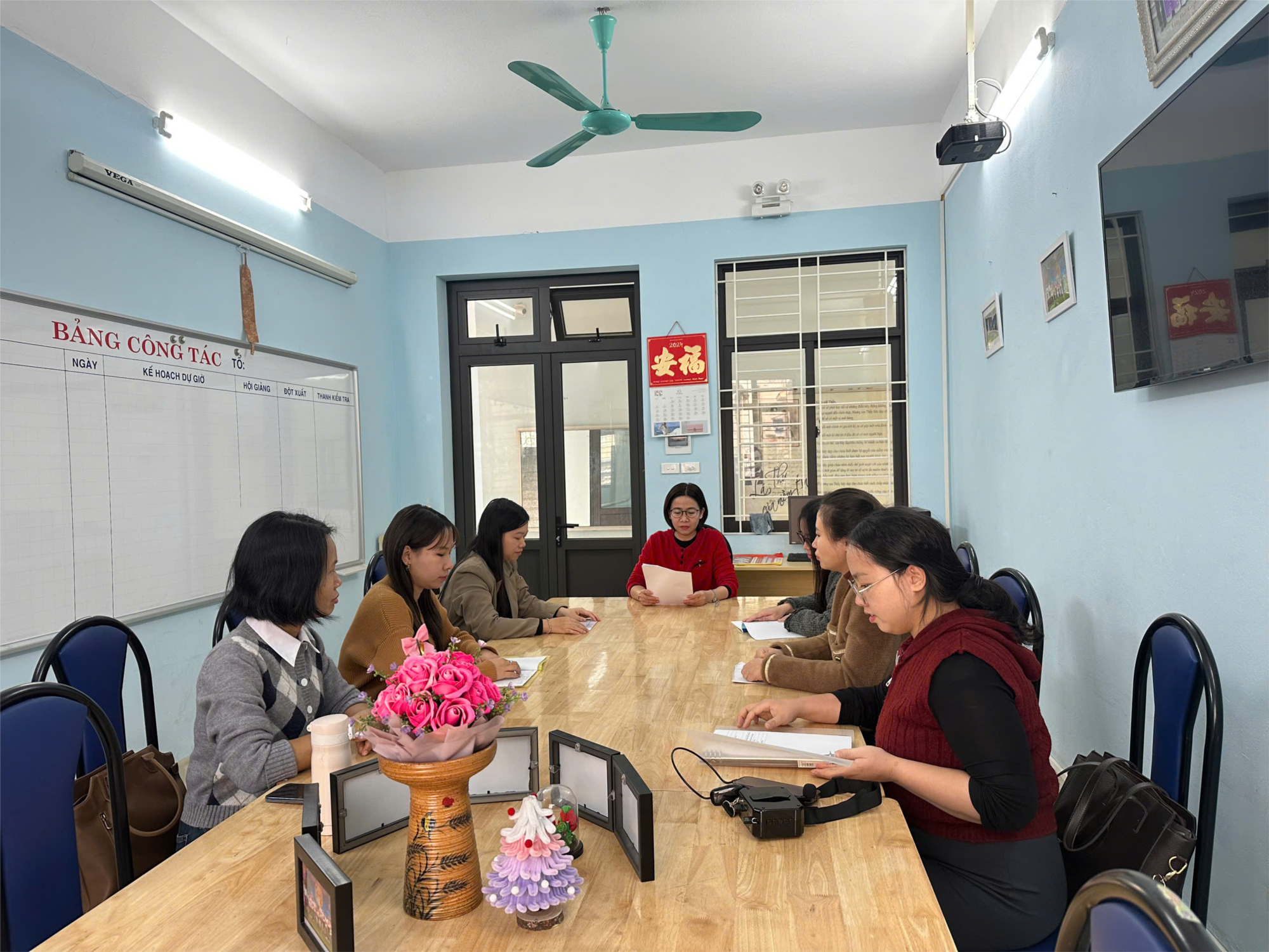 Tại buổi họp, đồng chí Vũ Thị Lê Bình – Tổ trưởng chuyên môn đã báo cáo tổng kết chất lượng giáo dục của tổ trong học kì I. Nhìn chung, các đồng chí giáo viên trong tổ đã thực hiện nghiêm túc nề nếp, quy chế chuyên môn, đảm bảo tiến độ vào điểm và hồ sơ sổ sách theo đúng quy định.