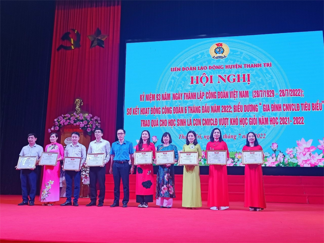 Ngày 21/7/2022, LĐLĐ huyện Thanh Trì tổ chức hội nghị kỉ niệm 93 năm ngày thành lập Công đoàn Việt Nam (28/7/1929-28/7/2022); sơ kết hoạt động công đoàn 6 tháng đầu năm 2022; biểu dương “Gia đình công nhân viên chức lao động tiêu biểu”; trao quà cho học sinh là con CNVCLĐ vượt khó học giỏi năm học 2021-2022.