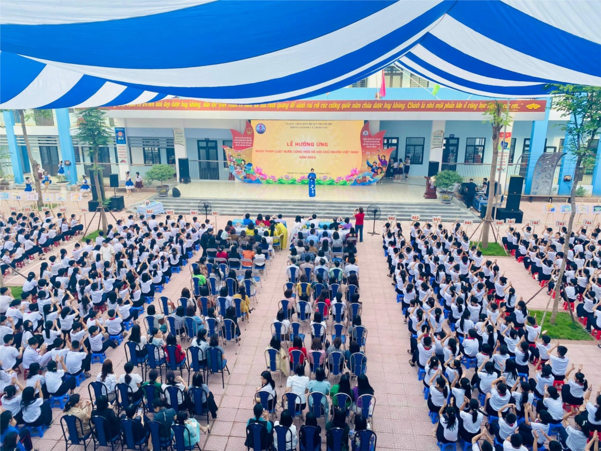 Mở đầu lễ hưởng ứng, Thầy giáo : Phạm Văn Ngát - Huyện ủy viên- Trưởng Phòng giáo dục và Đào tạo huyện Thanh Trì, lên phát động hưởng ứng “Ngày Pháp luật nước Cộng hòa xã hội chủ nghĩa Việt Nam” năm 2023. Ngay sau đó em Trần Hà Phương– học sinh lớp 9A1 - đại diện cho 872 học sinh nhà trường lên phát biểu hưởng ứng Ngày Pháp luật Việt Nam năm 2023.
