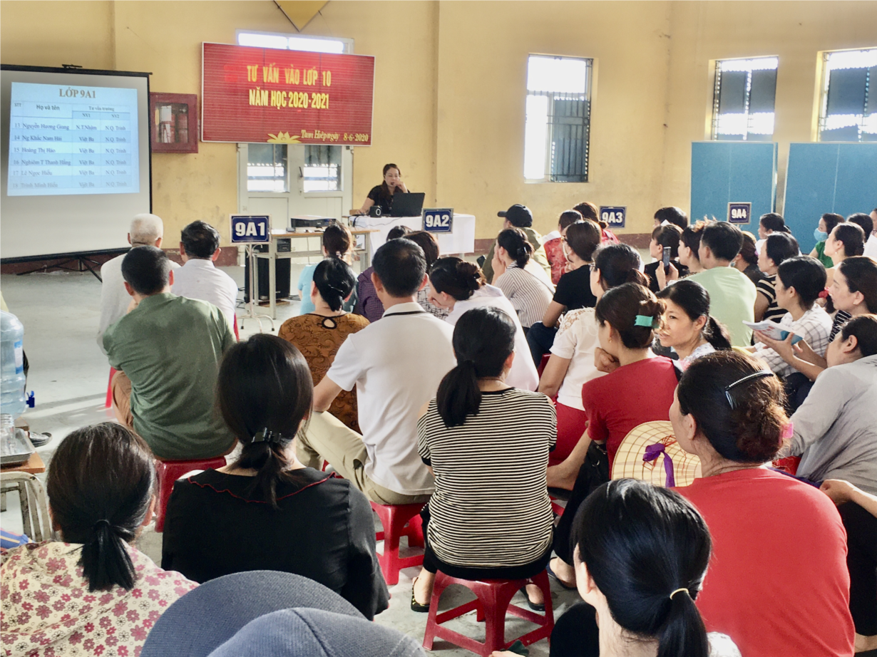 Tới dự buổi tư vấn có 174 PHHS và 4 thầy cô GVCN khối 9. Rất nhiều P/H tỏ ra băn khoăn lo lắng vì nội dung chương trình thi vào 10 năm học 2020-2021 có những điểm mới so với năm học trước, đặc biệt là thời gian ôn luyện của HS bị rút ngắn do đợt nghỉ học kéo dài gần 3 tháng của dịch Covid-19 chịu áp lực thay con. Năm nay, HS chỉ phải tham gia thi 3 môn là Văn-Toán-Anh(giảm bớt 1 môn so với năm học trước). Việc thi 3 môn vẫn tạo ra áp lực khá lớn với cả P/H và HS, trong đó môn Ngữ Văn khối lượng lý thuyết là khá lớn, HS không tích cực, chịu khó ôn luyện sẽ rất dễ mất điểm. Việc xuất hiện thêm 1 số trường THPT mới cũng tạo ra nhiều lựa chọn các em HS để phù hợp với sức học của mình. Qua buổi tư vấn của cô Hiệu trưởng, giúp các bậc CMHS giải tỏa bớt những vướng mắc, lo âu về việc ôn thi của con trong giai đoạn tới và kì thi vào 10 THPT năm hoc 2020-2021. Từ đó PH có những quyết định đúng đắn hơn trong việc chọn trường cho con em mình và động viên con vững tin ôn luyện!