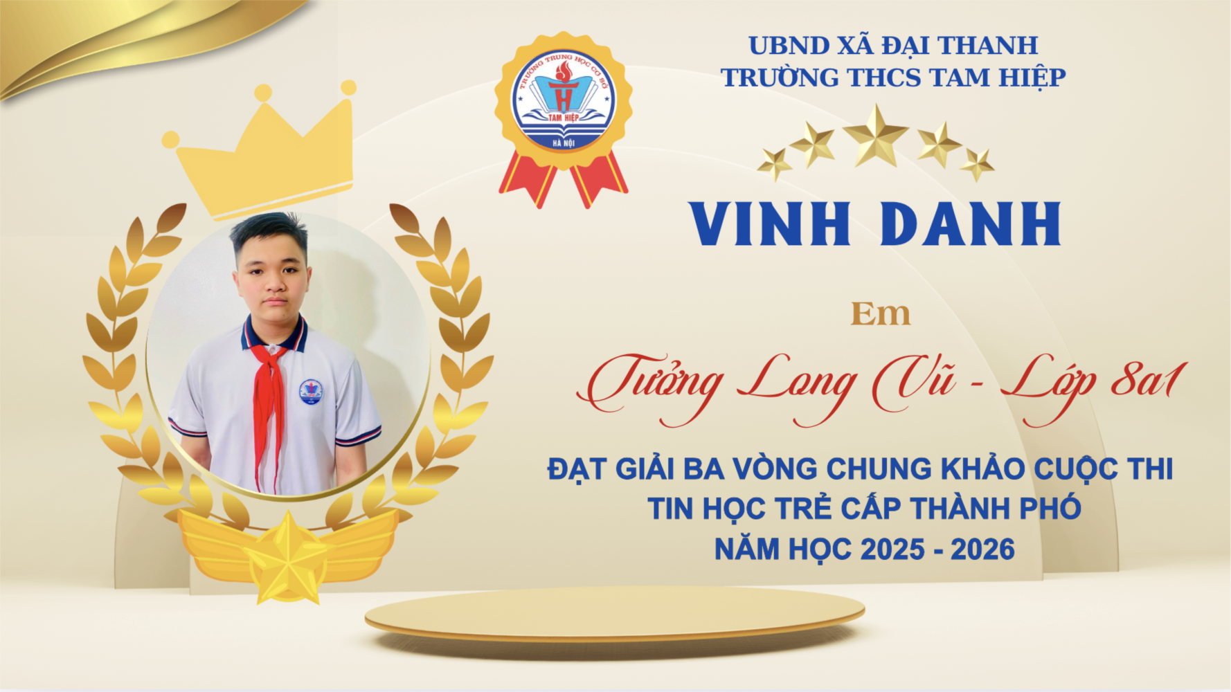 Tin vui liên tiếp về với trường THCS Tam Hiệp trong những ngày tháng 4 rực rỡ! Căn cứ theo Quyết định số 1713/SGDĐT-GDTrH ngày 24/04/2026 của Sở Giáo dục và Đào tạo Hà Nội về việc thông báo kết quả và xếp giải vòng Chung khảo cuộc thi Tài năng Tin học trẻ quốc tế thành phố Hà Nội năm học 2025 - 2026, em Tưởng Long Vũ – học sinh lớp 8A1 của nhà trường đã xuất sắc ghi tên mình vào bảng vàng thành tích.