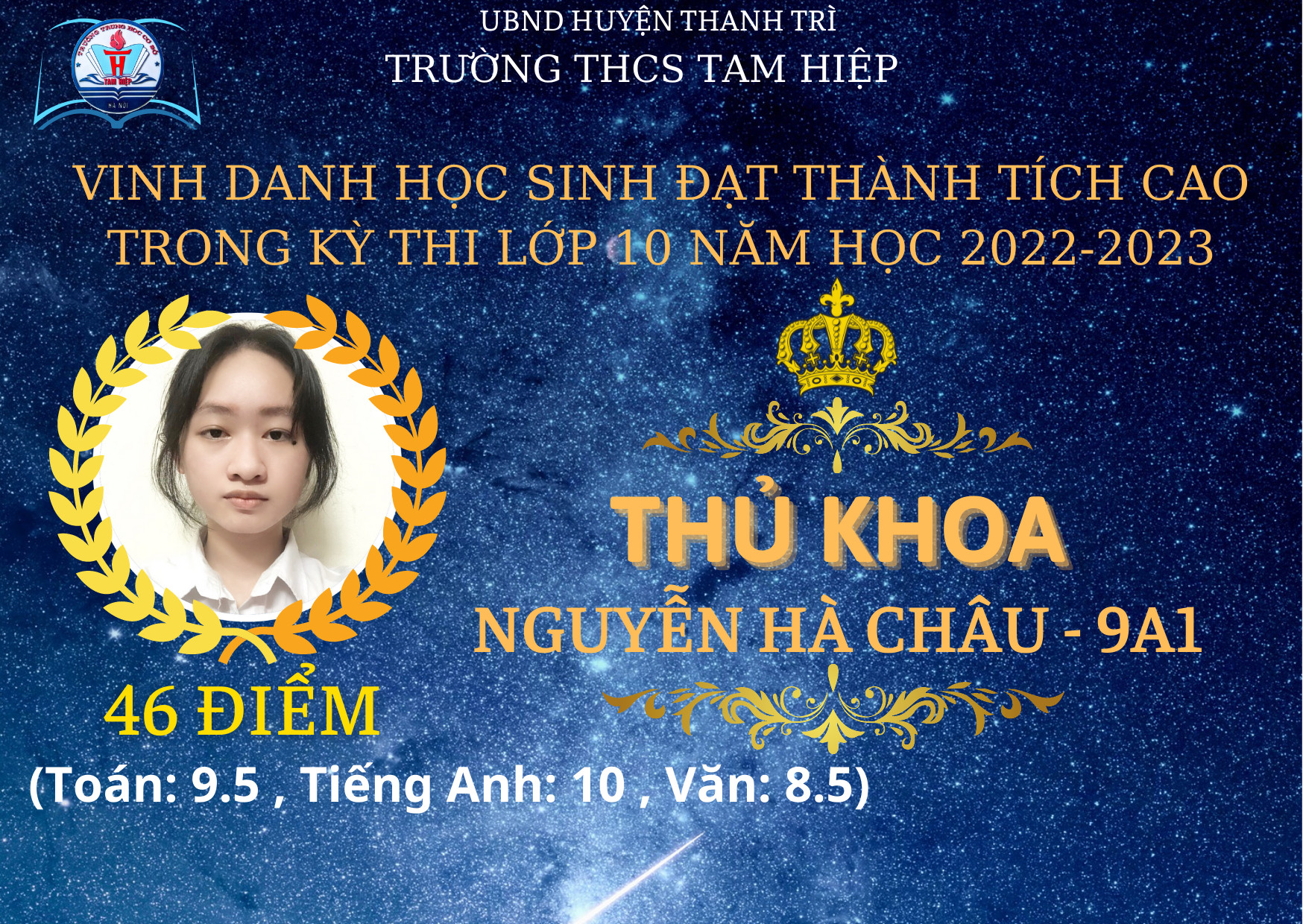 Kỳ thi vào 10 THPT vừa qua là một cột mốc đáng nhớ cho toàn thể giáo viên và học sinh nhà trường. Bằng sự quyết tâm, lòng ham học hỏi của các em học sinh khối 9 cùng nhiệt huyết và ngọn lửa yêu nghề của các thầy cô giáo, học sinh khối 9 trường THCS Tam Hiệp đã gặt hái được nhiều thành công trên con đường chinh phục tri thức. Các em hoàn thành xuất sắc mục tiêu thi đỗ trường công lập theo nguyện vọng của bản thân và gia đình. Tiêu biểu nhất trong số 185 học sinh đăng ký thi vào 10 có 3 em học sinh đạt tổng số điểm 3 môn trên 44 điểm: Nguyễn Hà Châu lớp 9A1 đạt 46 điểm; Phạm Ngọc Diệp lớp 9A1 đạt 44,75 điểm; Nguyễn Thị Minh Hiền lớp 9A1 đạt 44,5 điểm.